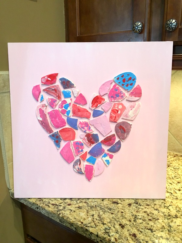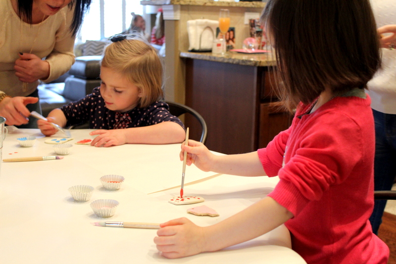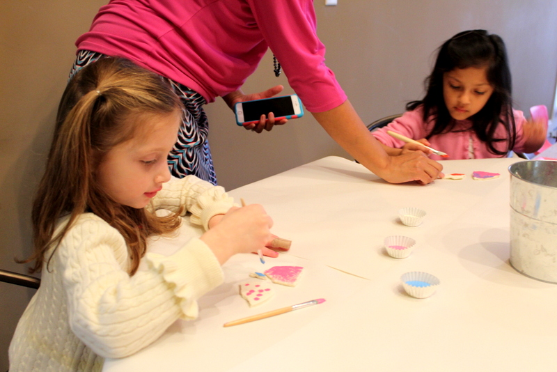 I originally planned to make salt dough heart ornaments for all of the girls to paint. Well, I did make salt dough hearts. I made a ton of them. I had them drying on the dining room table for days. The night before the party, I thought that some were still a little soft, maybe because we have had such cold weather. So I stuck them in the oven at 200* to finish drying out the dough. Well, as soon as they came out of the oven they all started to crack into pieces. Insert panic mode here. The party was the next morning, and we already bought all the paint for this project.