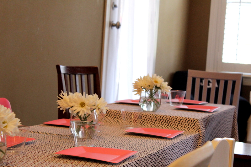 I set up on big kids sized table for the girls so that they could all sit together while they ate. I have a few IKEA Lack tables in the playroom, so I pushed them together with another kids sized table that I had to create one long, rectangular table. I needed a table cloth big enough so I went to the fabric store and picked an adorable printed fabric. I had them cut how much I needed to cover all four tables. (I won’t tell you how much I accidently spent on said fabric after the store wouldn’t take my coupon, but no worries. I just told Mike I would make a pair of palazzo pants out of the fabric so it wouldn’t be a total waste. If anyone wants a pair of palazzo pants, let me know, haha!)
