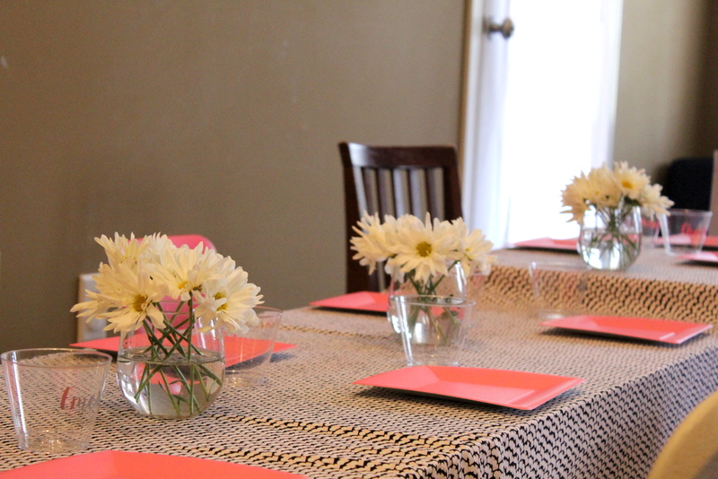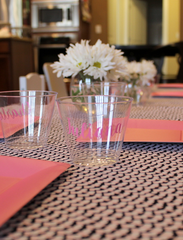 I had leftover pink disposable plates from Mini’s 2nd birthday party (this is why I don’t throw anything away..) so we set the table with those. I bought small clear cups for the girls and personalized each one with their name in vinyl. It was so fun to watch them find their spot at the table and use their very own personalized cup. I picked up a bunch of simple flowers from Costco and trimmed half of them down to make table centerpieces. I used stemless wine glasses as the vases and they were the perfect height!