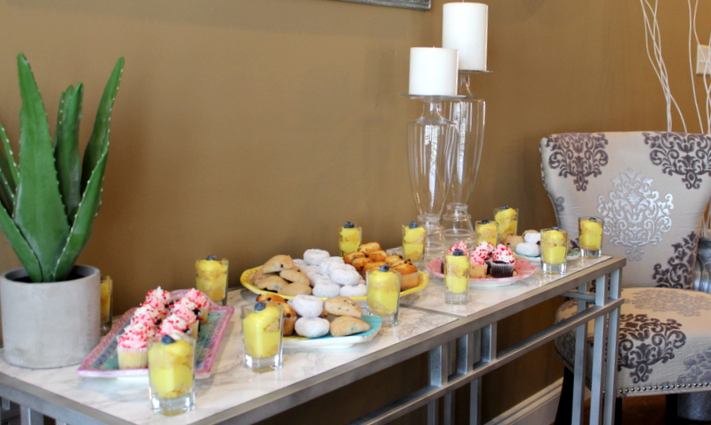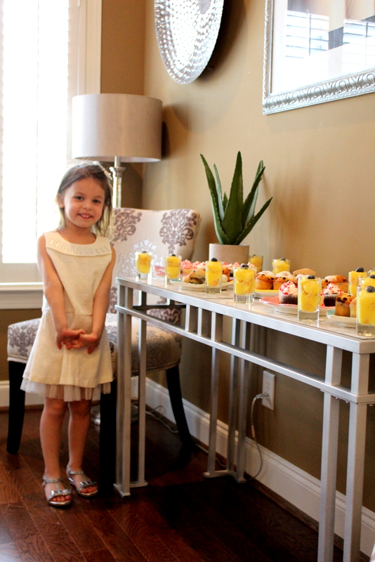 For drinks I grabbed some raspberry lemonade for the girls. I also made a batch of Tazo Iced passion tea lemonade (it’s SO good!). And of course, I had a make your own mimosa bar for the moms! I put out a few bottles of prosecco on ice and had carafes of grapefruit juice and orange juice so moms could make their mimosa to their liking. PARTY TIP: I take a 12 count cupcake pan a few days before the party and pour water into all the cupcake holes. Then I stick a little slice of lemon in each one. I freeze the tin and when it’s frozen pop out all the big ice cubes. It is perfect for keeping pitchers of water and tea cold and you can even see the slices of lemon floating around the drinks.