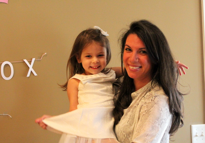 I strung some garland that I made with my silhouette cameo in both hearts and X + O’s on the wall beside the big table. Mini just loved it. (After the party I took the garland off that wall and strung it on our fireplace!)