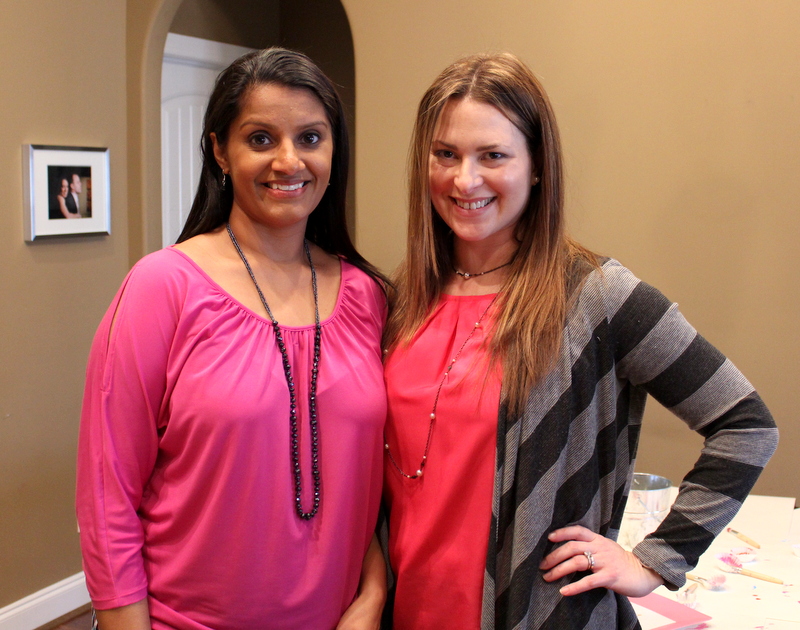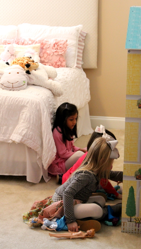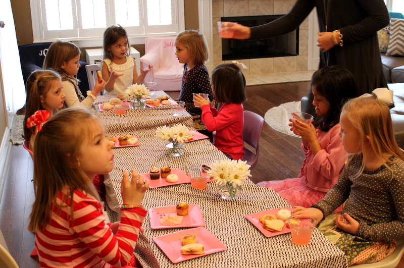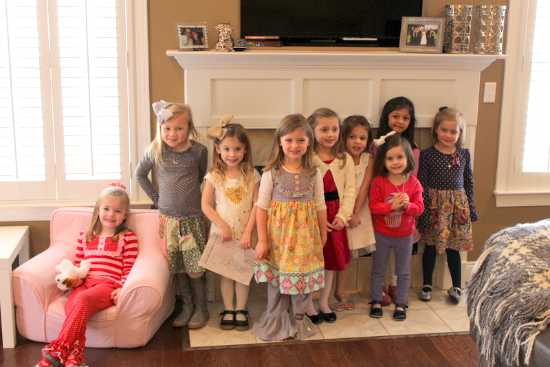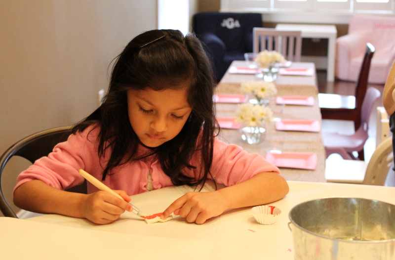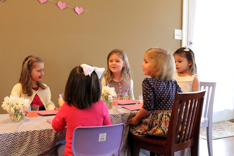 We invited all of the girls in her class this year so we were expecting a pretty full house. I planned on serving brunch and having a craft activity for all of the girls to work on. Almost all of the girls Mini invited came with their moms and they all looked so pretty in their Valentine’s Day outfits. I was impressed with how well behaved all of the girls were. Last year it was a bit more chaotic with a bunch of 3 year old girls running around but this year the girls sat at their big table and ate lunch and chatted just like little ladies. Such a difference one year made. It was so cute to see them all sitting and talking together as they munched on tiny sandwiches and sipped their lemonade. They all worked on their craft and even decided they all wanted to color pictures after.