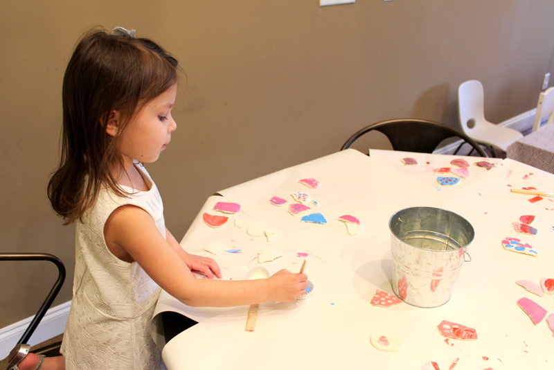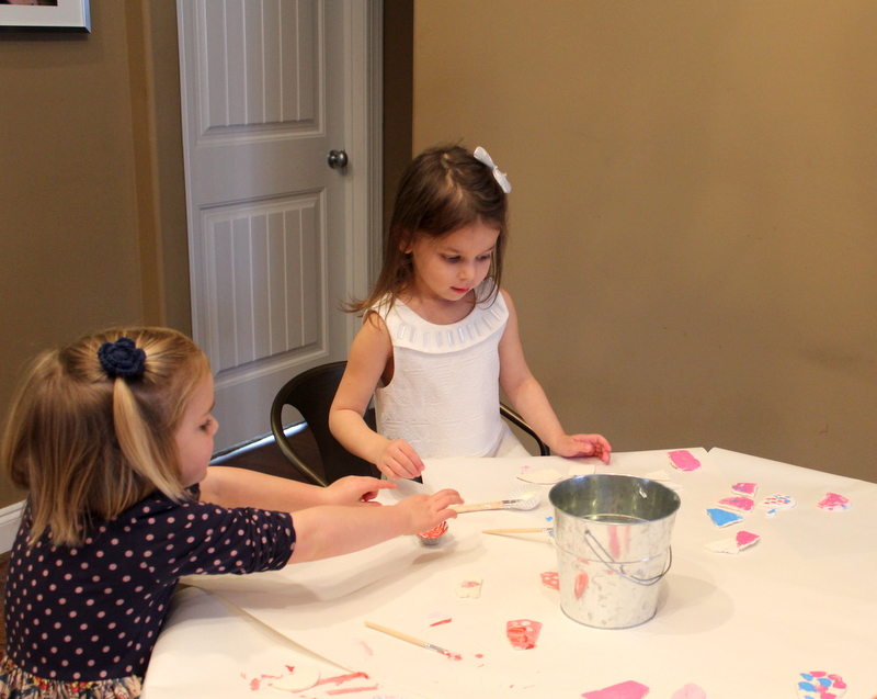 My GENIUS of a best friend suggested that I have all the girls paint pieces of the salt dough in the colors that Mini picked at the store, then glue them all onto a board to make a mosaic out of them. Well that is exactly what I did. And I am so in love with this project. (See it in the pictures below!) It is the perfect keepsake from her tea party that all of her friends had a part in making. Mini can’t decide where in her room to hang it, but she thinks it is just “awesome”!
