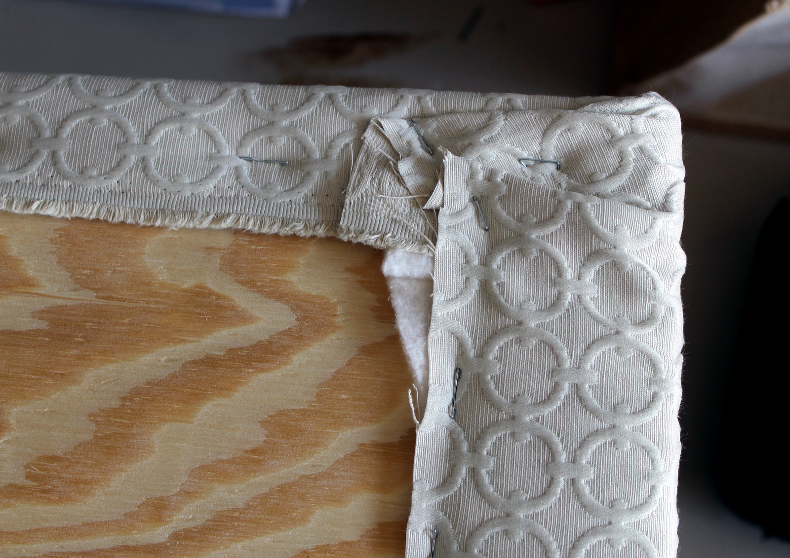 Now lay the fabric over the batting and do that same thing with the fabric. Again, close attention to the corners. Mike thinks he is amazing at corners. He’s not. But whatever. He says its like wrapping a Christmas present. I don’t know when he does that, because mine usually come wrapped straight from the Bloomingdale’s customer service department. Now, they know corners.