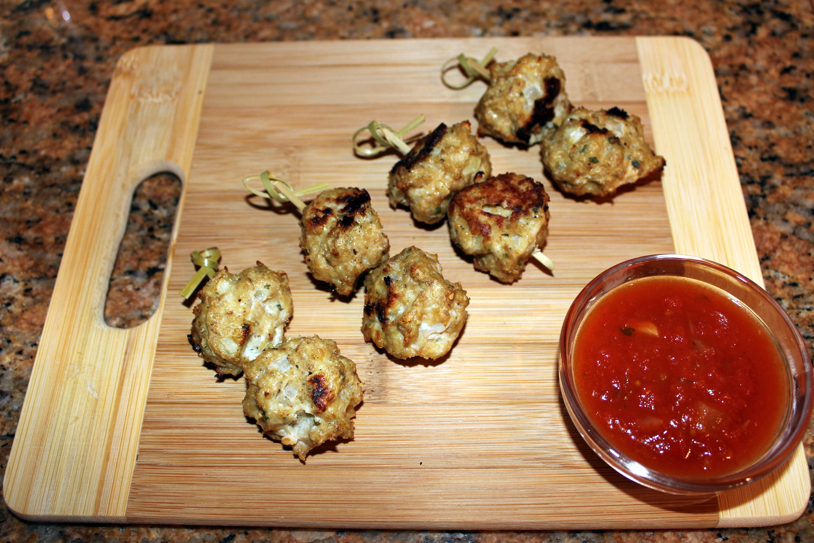 1 lb lean ground chicken, 3 cloves chopped garlic, 1 chopped onion, 2 egg whites, 1/3 cup skim milk, parsley, garlic powder, pepper, italian seasoning