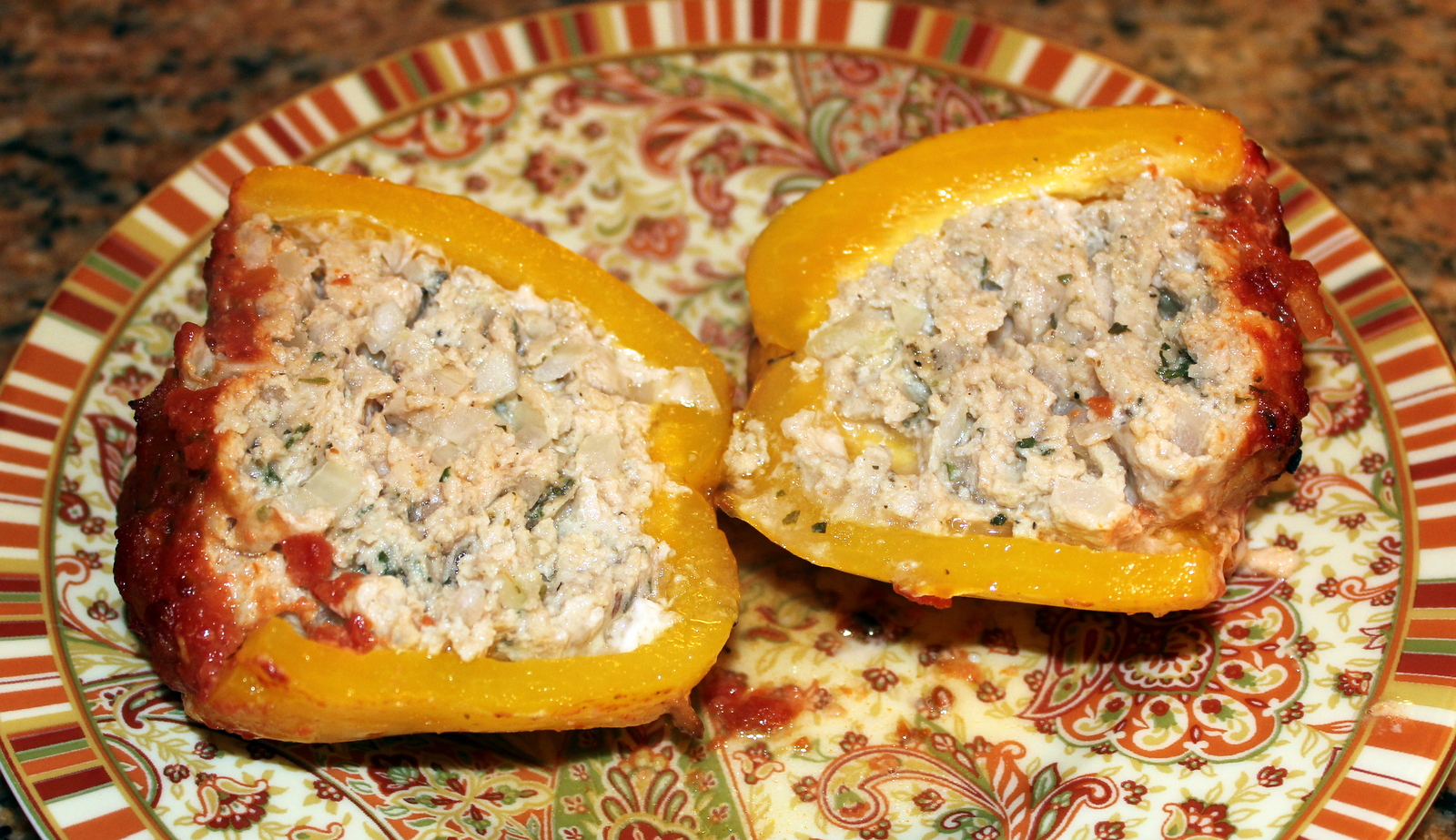 I placed the peppers standing upright in a baking loaf pan. I then spooned homemade marinara all over the tops of them.