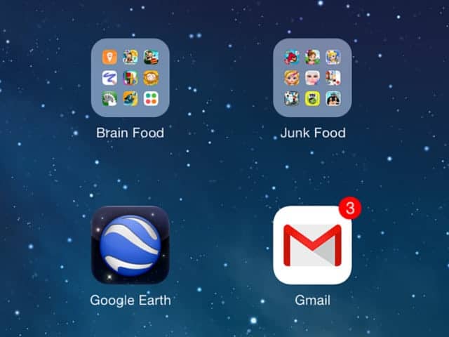 “So we’re going to put those apps in a folder called Brain Food. Everything else, we’ll put in a folder called Junk Food. What do you know about junk food?”