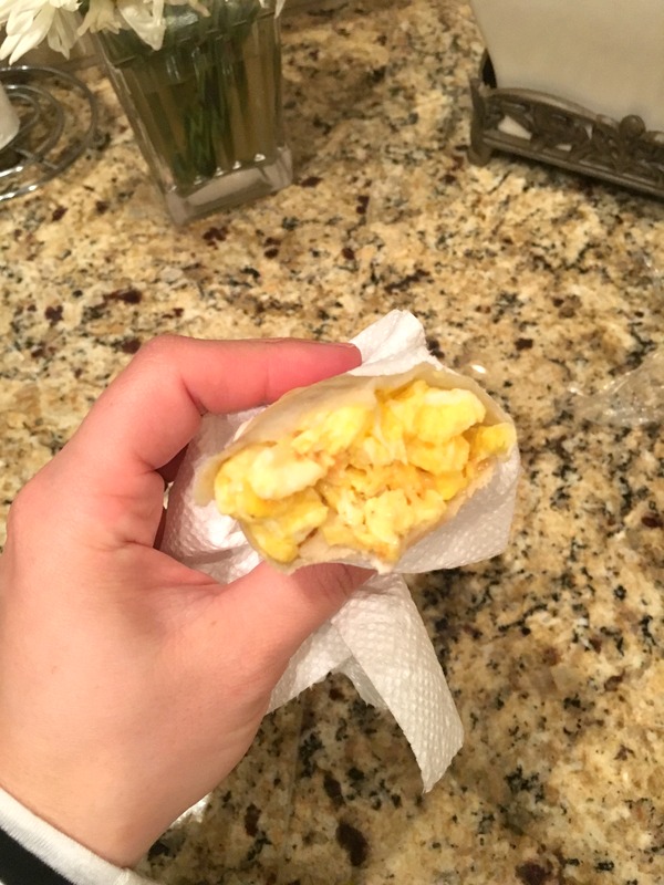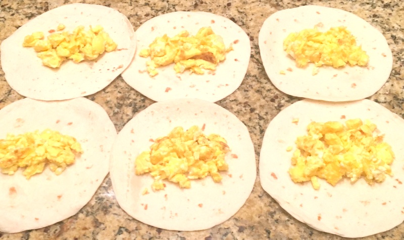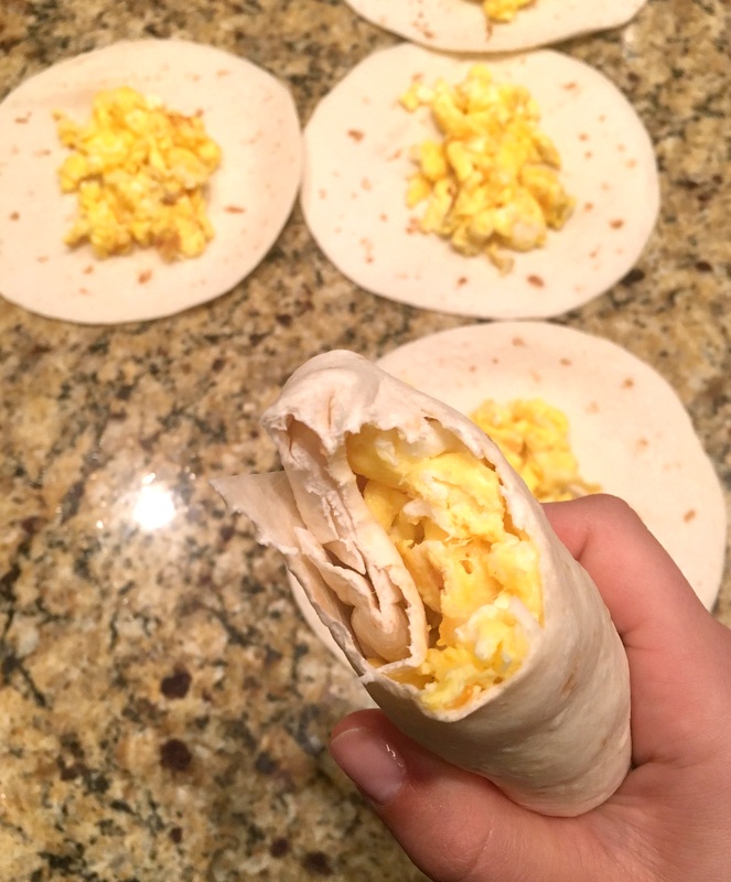 Scramble the eggs. At the very end of the cooking process, toss in the shredded cheese and let it get all melty onto the eggs. In the meantime, lay out the tortillas on your counter top. Once the eggs have cooled for a second, scoop an even amount onto the center of each tortilla. (See photo). In order to roll the tortillas tight you need to tuck in the sides and roll from the bottom to the top. If you can’t figure out how I am sure there is an instructional youtube video to help. If not, let me know and I’ll make one, haha. Once they are rolled, place them seam side down while you of course eat one.
