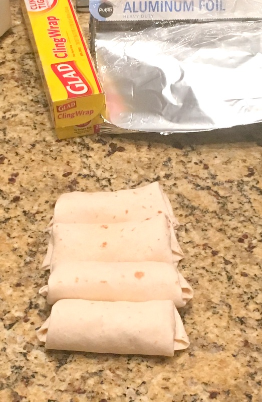 Wrap each burrito first in saran wrap and then in a piece of aluminum foil. Toss them all in the freezer until you are ready to eat them. When you want one, take it out of the aluminum foil. Place the burrito in the saran wrap into the microwave. Microwave the burrito on 50% for 1 minute. Flip it over and do it again, 50% for 1 more minute. Then unwrap it and enjoy!