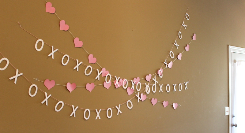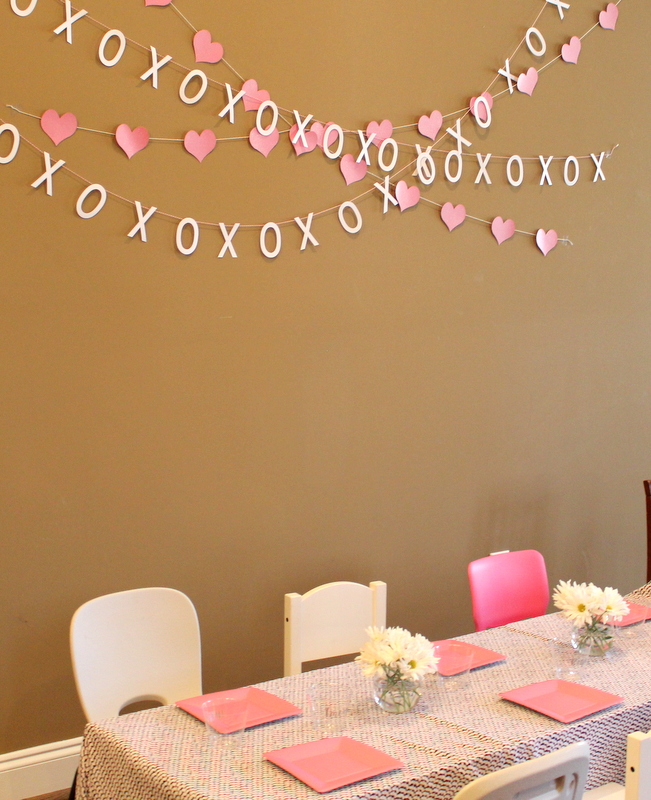 I strung some garland that I made with my silhouette cameo in both hearts and X + O’s on the wall beside the big table. Mini just loved it. (After the party I took the garland off that wall and strung it on our fireplace!)