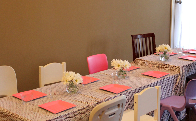 I set up on big kids sized table for the girls so that they could all sit together while they ate. I have a few IKEA Lack tables in the playroom, so I pushed them together with another kids sized table that I had to create one long, rectangular table. I needed a table cloth big enough so I went to the fabric store and picked an adorable printed fabric. I had them cut how much I needed to cover all four tables. (I won’t tell you how much I accidently spent on said fabric after the store wouldn’t take my coupon, but no worries. I just told Mike I would make a pair of palazzo pants out of the fabric so it wouldn’t be a total waste. If anyone wants a pair of palazzo pants, let me know, haha!)