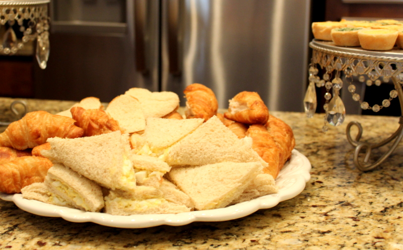 We had little tea sandwiches that included: egg salad on wheat bread // chicken salad in mini croissants // heart shaped pb&j. I served spinach and cheese mini quiche and for the first time ever a ham and swiss puff pastry pinwheel. (My friend Christina and I literally assembled and threw that in the oven last minute and it was pretty tasty!)