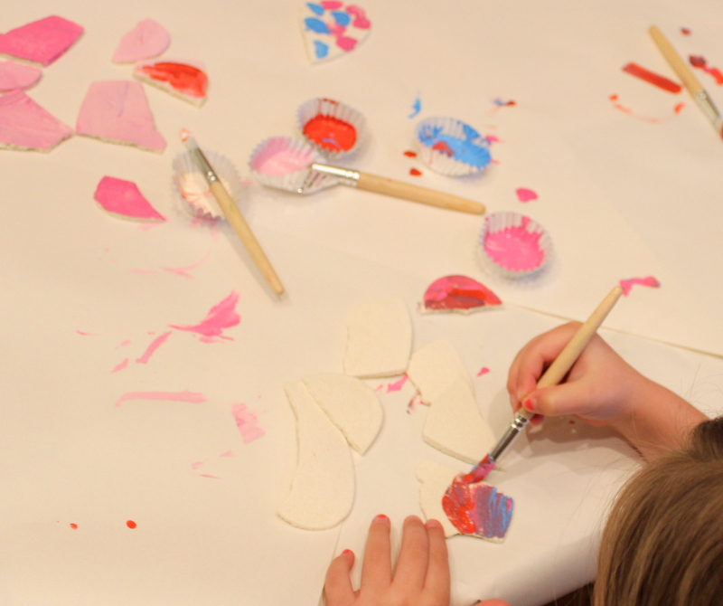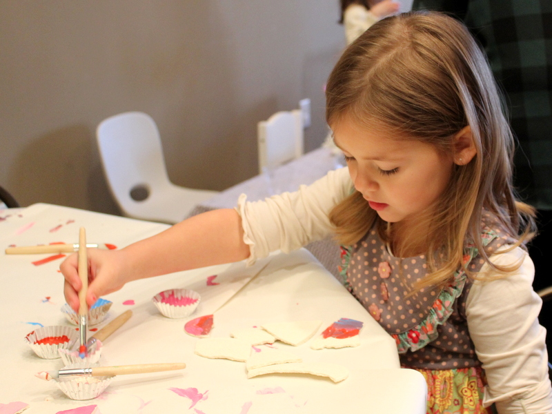 I originally planned to make salt dough heart ornaments for all of the girls to paint. Well, I did make salt dough hearts. I made a ton of them. I had them drying on the dining room table for days. The night before the party, I thought that some were still a little soft, maybe because we have had such cold weather. So I stuck them in the oven at 200* to finish drying out the dough. Well, as soon as they came out of the oven they all started to crack into pieces. Insert panic mode here. The party was the next morning, and we already bought all the paint for this project.