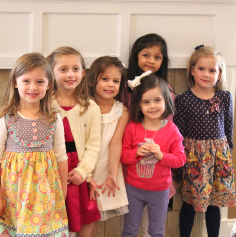 We invited all of the girls in her class this year so we were expecting a pretty full house. I planned on serving brunch and having a craft activity for all of the girls to work on. Almost all of the girls Mini invited came with their moms and they all looked so pretty in their Valentine’s Day outfits. I was impressed with how well behaved all of the girls were. Last year it was a bit more chaotic with a bunch of 3 year old girls running around but this year the girls sat at their big table and ate lunch and chatted just like little ladies. Such a difference one year made. It was so cute to see them all sitting and talking together as they munched on tiny sandwiches and sipped their lemonade. They all worked on their craft and even decided they all wanted to color pictures after.