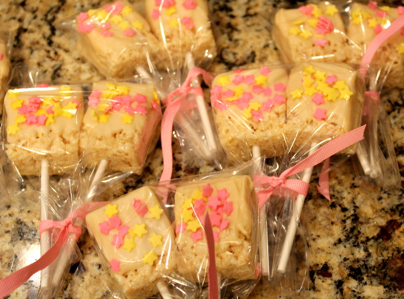 Of course we needed a dessert bar. Which all the girls were happily enjoying before having any thing to eat for lunch 🙂 I just picked up some items at the store as to not make too much work for myself. We had mini powdered donuts // mini vanilla and chocolate cupcakes // blueberry scones // chocolate chip muffins // lemon bar + pudding individual treats. A few of our friends generously brought us some muffins and lemon bars to add to our sweets table! Lastly, if you follow me on Instagram you may have seen I made a batch of chocolate covered rice krispie treat pops last week. Well, we had so many sweets that I ended up wrapping them for the girls to take home! You can see the picture below.