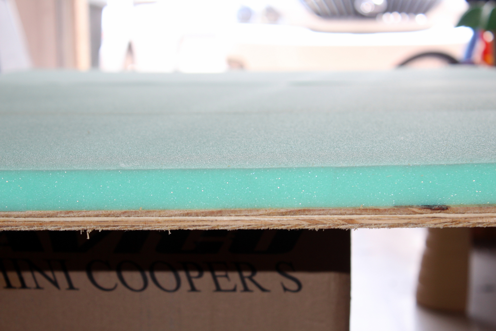 Go out into the garage (I don’t want you to spray the adhesive in your living room. Your husband will never forgive you. Mark my words). We placed our plywood on a huge box so we could work on it. We sprayed the adhesive all over the plywood and laid out the foam so that it covered it in it’s entirety.