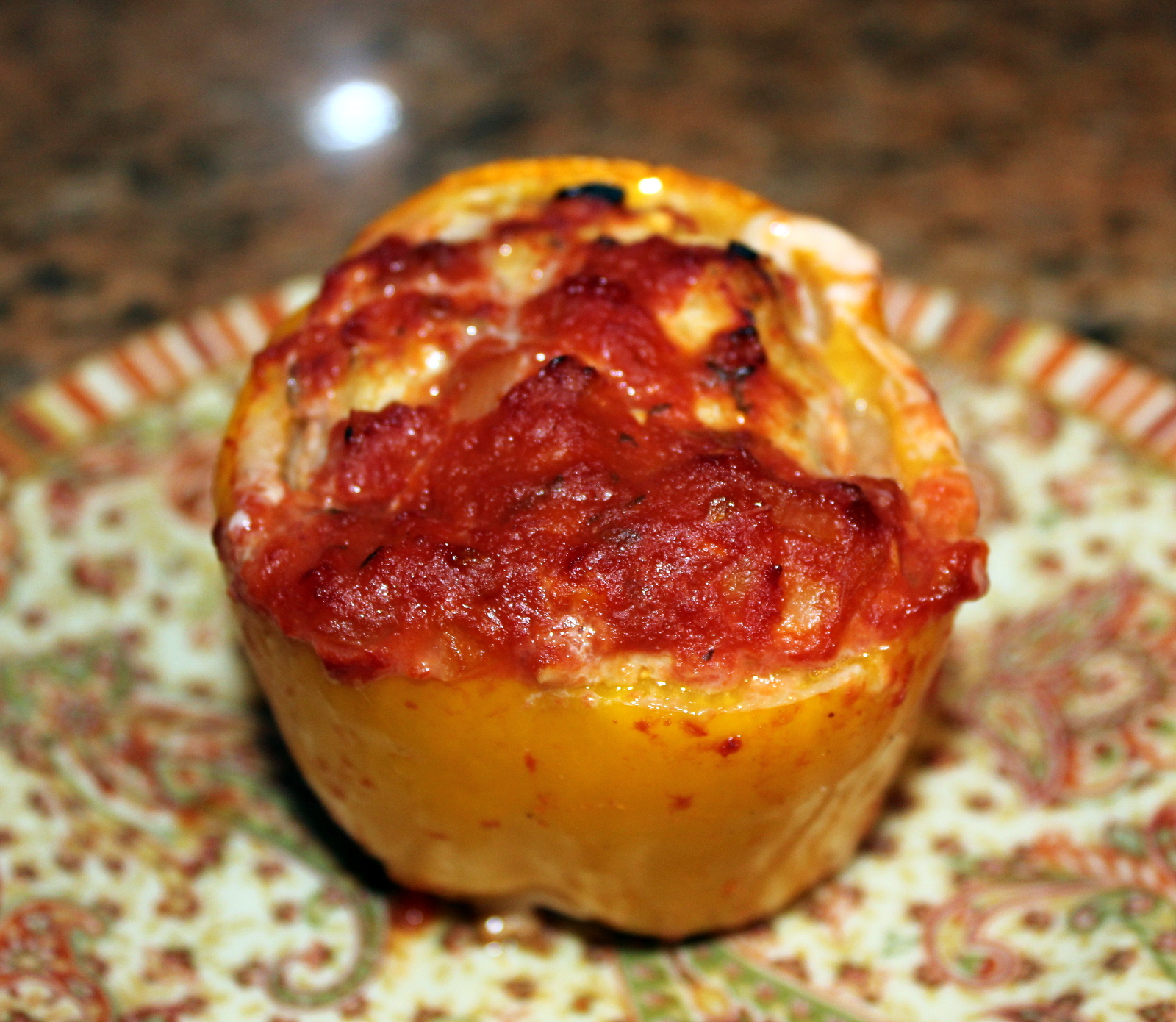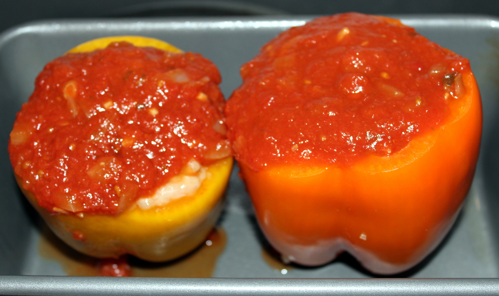 I placed the peppers standing upright in a baking loaf pan. I then spooned homemade marinara all over the tops of them.