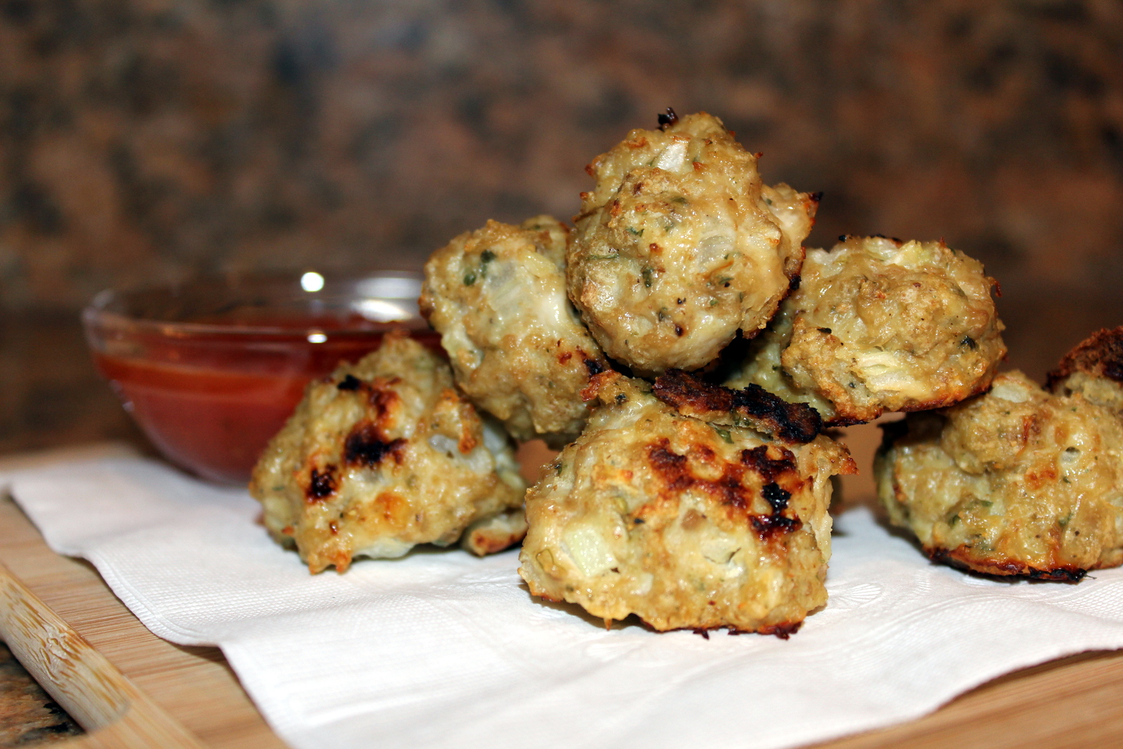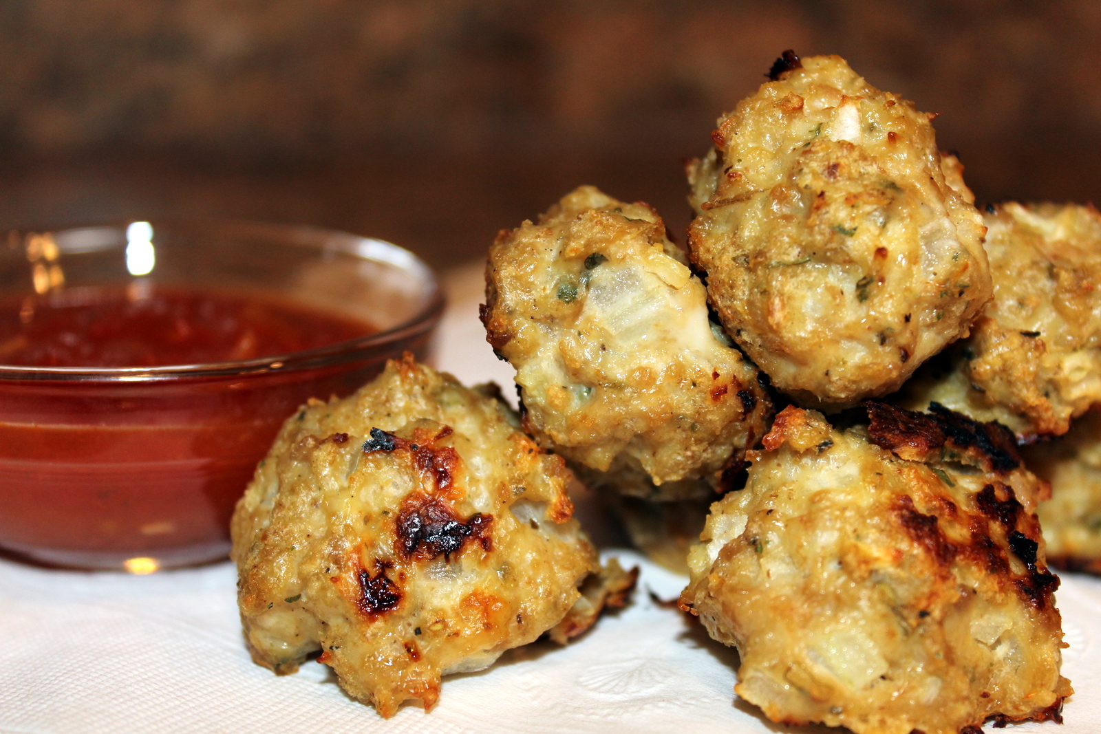 After looking at the leftover chicken mixture I decided to whip up some meatballs for the minster. I added to the mixture 1/3 cup breadcrumbs and a healthy scoop of parmesan cheese. Then I rolled them into little balls and placed them on a greased cookie sheet. It was kind of difficult to roll into balls, because I didn’t use a whole lot of bread crumb to hold the mixture together. Do your best. Imperfection is beauty. Even when your a meatball.