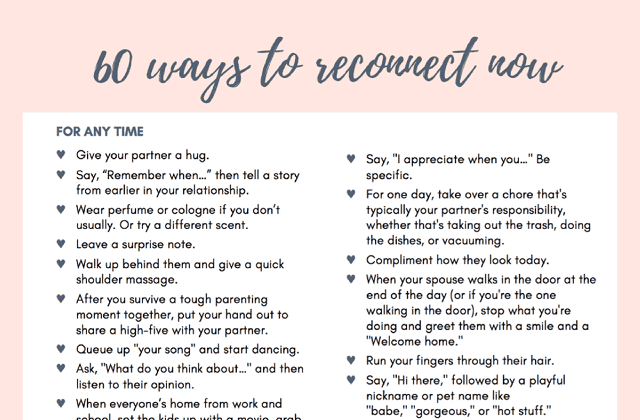 When you need ideas for how to connect with your partner even when you’re busy and tired, use this cheat sheet of 60 simple ways to reconnect.